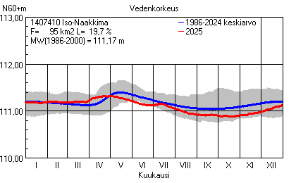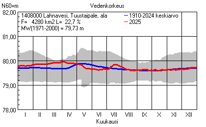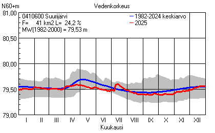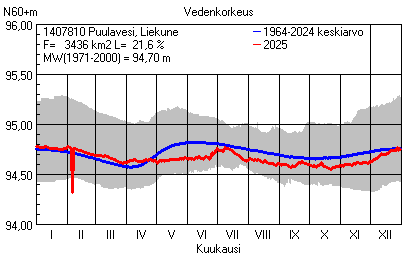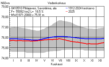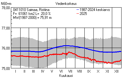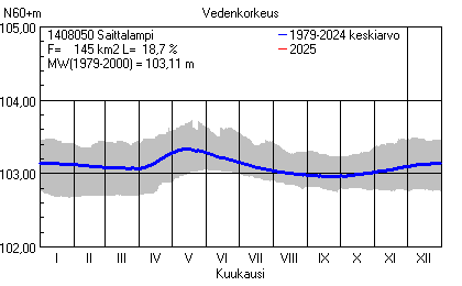 Päivitetty 02.01.2026 18:58 Vesistöjen vedenkorkeus Etelä-Savon elinkeino-, liikenne- ja ympäristökeskuksen alueella 2025Muut korkeusjärjestelmät: N2000 N60 NN N43 AsteikkoKuvat ovat linkkejä suurempiin kuviin ja havaintojen lukuarvoihin Päivittäisten vedenkorkeuksien vaihteluväli (harmaa alue) ja keskiarvo (sininen viiva) on laskettu keskiarvon esittämälle jaksolle
