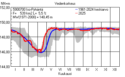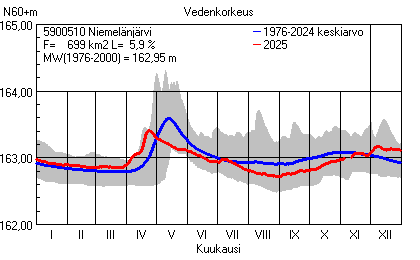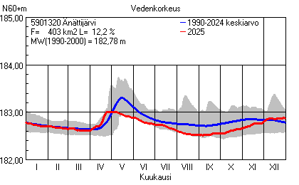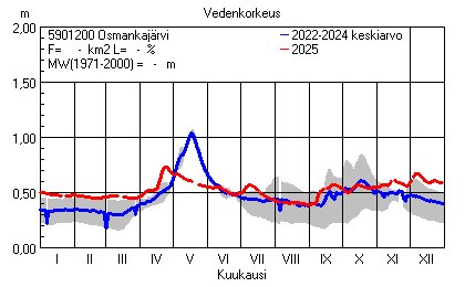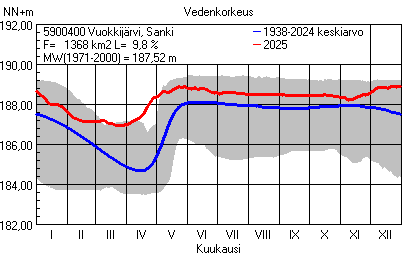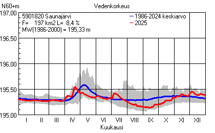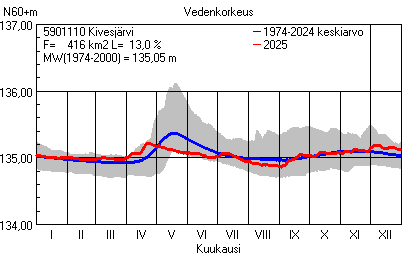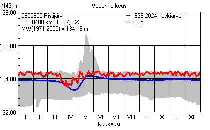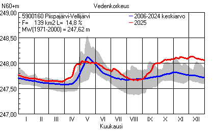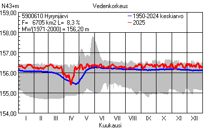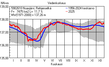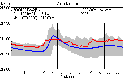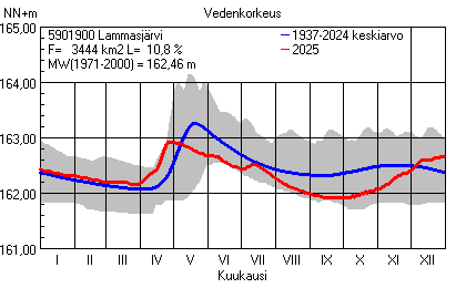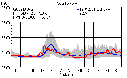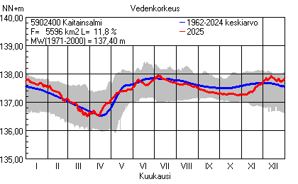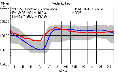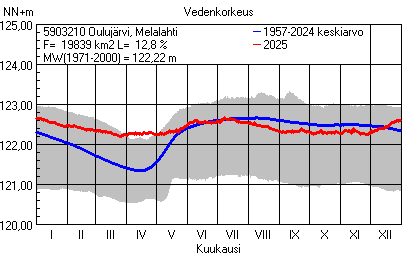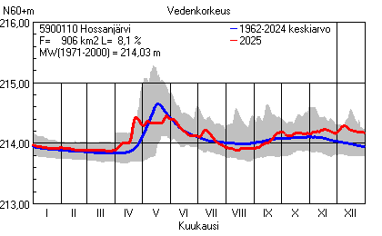 Päivitetty 02.01.2026 18:58 Vesistöjen vedenkorkeus Kainuun elinkeino-, liikenne- ja ympäristökeskuksen alueella 2025Muut korkeusjärjestelmät: N2000 N60 NN N43 AsteikkoKuvat ovat linkkejä suurempiin kuviin ja havaintojen lukuarvoihin Päivittäisten vedenkorkeuksien vaihteluväli (harmaa alue) ja keskiarvo (sininen viiva) on laskettu keskiarvon esittämälle jaksolle