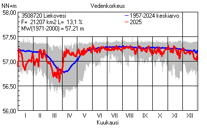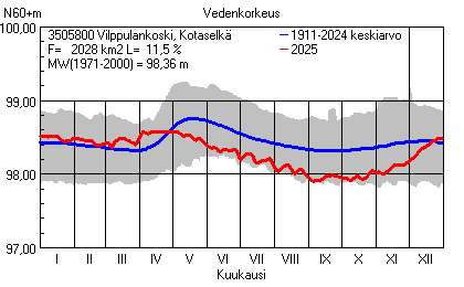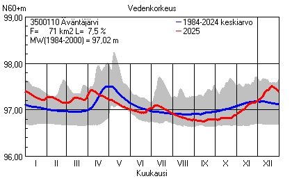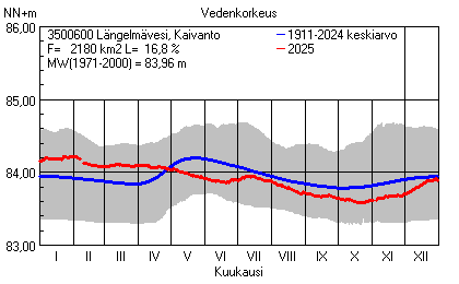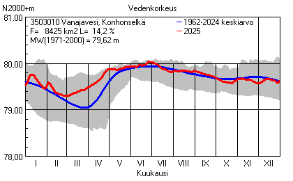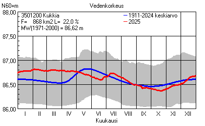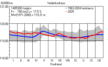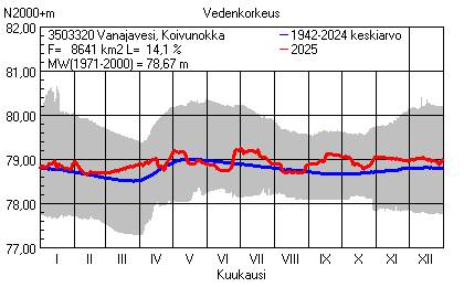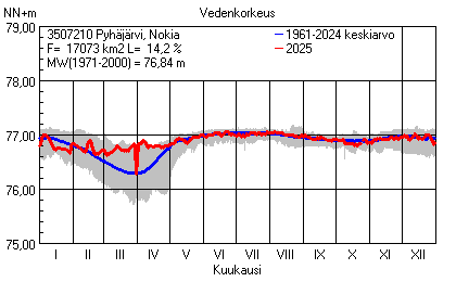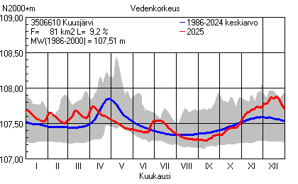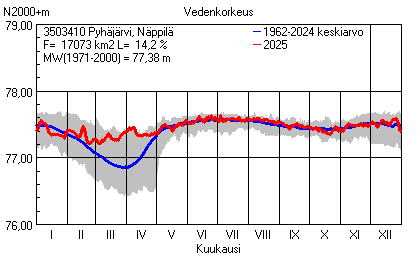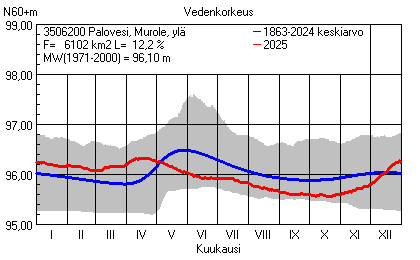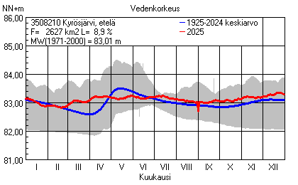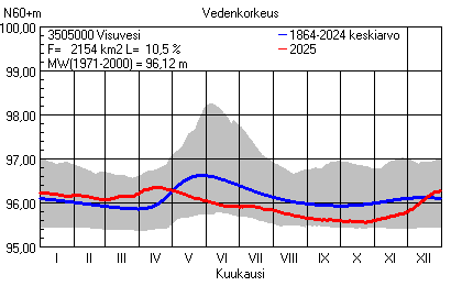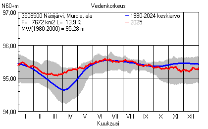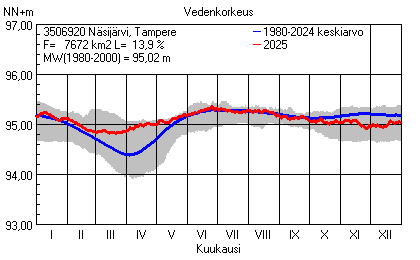 Päivitetty 02.01.2026 18:58 Vesistöjen vedenkorkeus Pirkanmaan elinkeino-, liikenne- ja ympäristökeskuksen alueella 2025Muut korkeusjärjestelmät: N2000 N60 NN N43 AsteikkoKuvat ovat linkkejä suurempiin kuviin ja havaintojen lukuarvoihin Päivittäisten vedenkorkeuksien vaihteluväli (harmaa alue) ja keskiarvo (sininen viiva) on laskettu keskiarvon esittämälle jaksolle