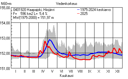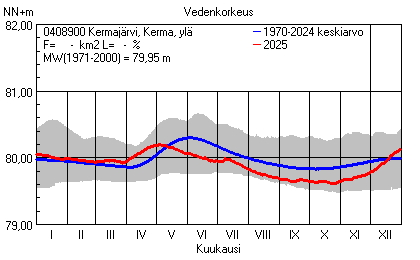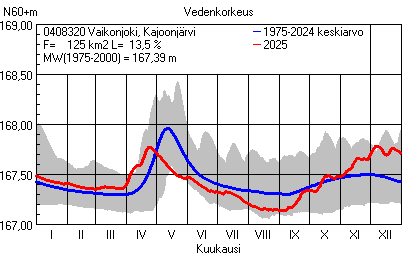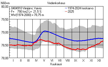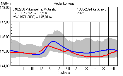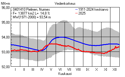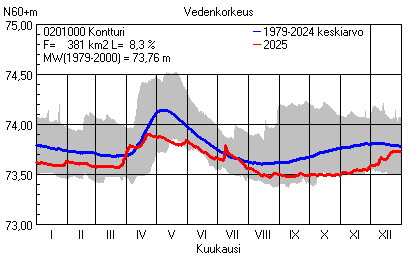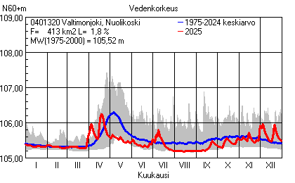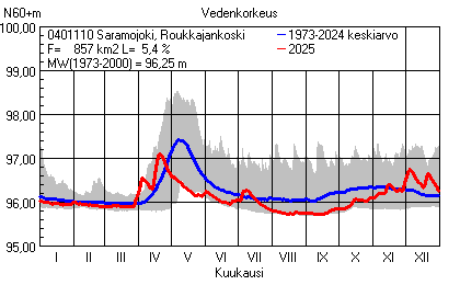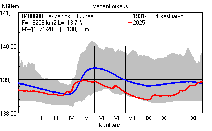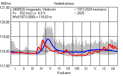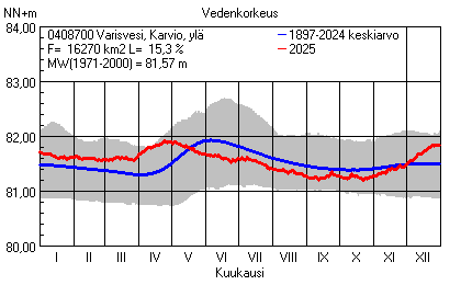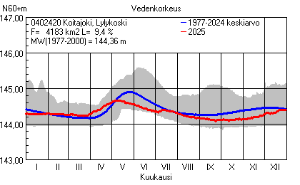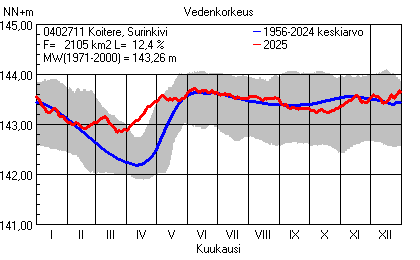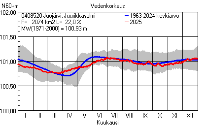 Päivitetty 02.01.2026 18:58 Vesistöjen vedenkorkeus Pohjois-Karjalan elinkeino-, liikenne- ja ympäristökeskuksen alueella 2025Muut korkeusjärjestelmät: N2000 N60 NN N43 AsteikkoKuvat ovat linkkejä suurempiin kuviin ja havaintojen lukuarvoihin Päivittäisten vedenkorkeuksien vaihteluväli (harmaa alue) ja keskiarvo (sininen viiva) on laskettu keskiarvon esittämälle jaksolle