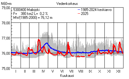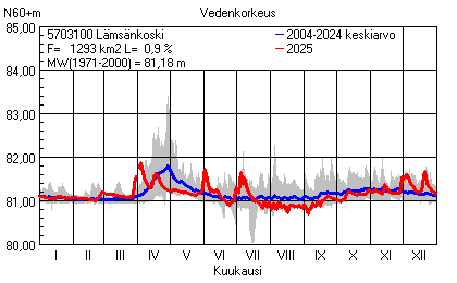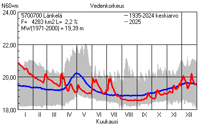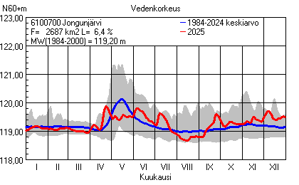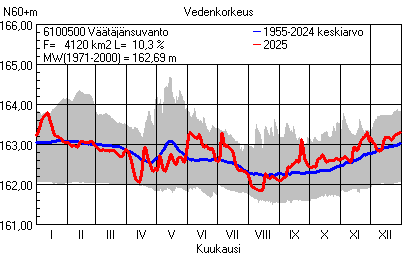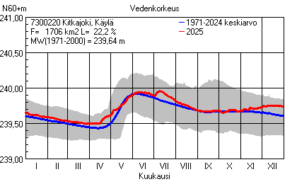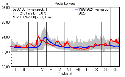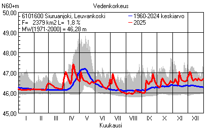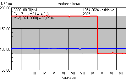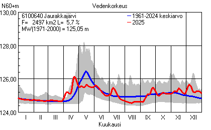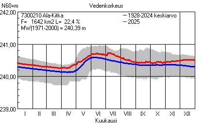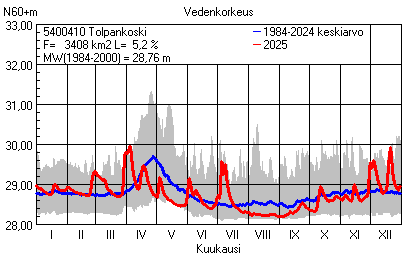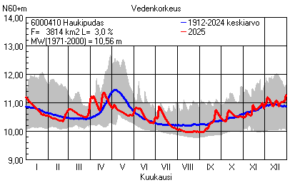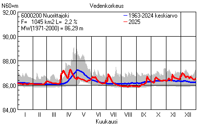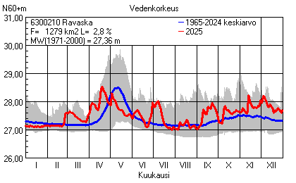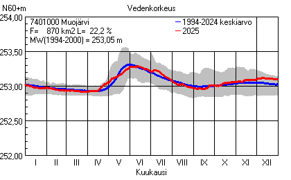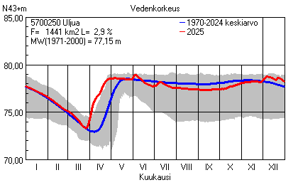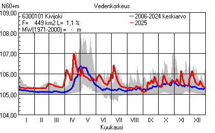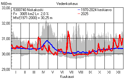 Päivitetty 02.01.2026 18:58 Vesistöjen vedenkorkeus Pohjois-Pohjanmaan elinkeino-, liikenne- ja ympäristökeskuksen alueella 2025Muut korkeusjärjestelmät: N2000 N60 NN N43 AsteikkoKuvat ovat linkkejä suurempiin kuviin ja havaintojen lukuarvoihin Päivittäisten vedenkorkeuksien vaihteluväli (harmaa alue) ja keskiarvo (sininen viiva) on laskettu keskiarvon esittämälle jaksolle
