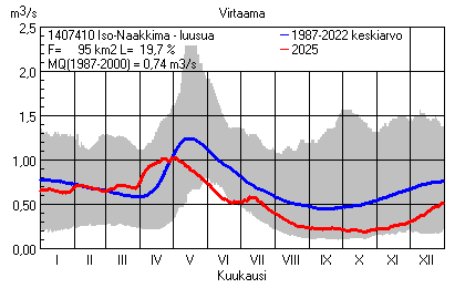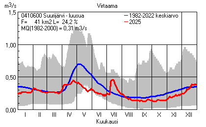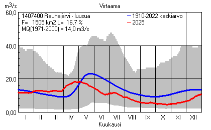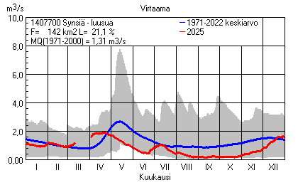Päivitetty 02.01.2026 18:57 Vesistöjen virtaama Etelä-Savon elinkeino-, liikenne- ja ympäristökeskuksen alueella 2025Kuvat ovat linkkejä suurempiin kuviin ja havaintojen lukuarvoihin Päivittäisten virtaamien vaihteluväli (harmaa alue) ja keskiarvo (sininen viiva) on laskettu keskiarvon esittämälle jaksolle