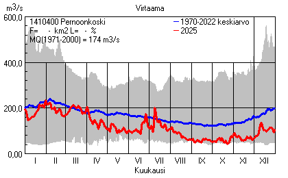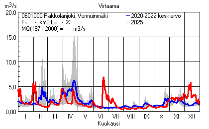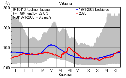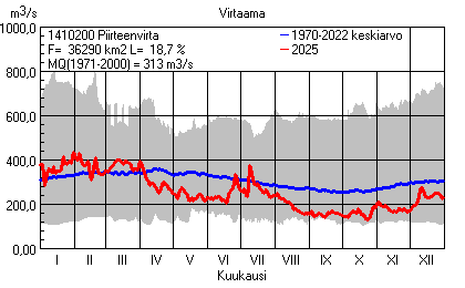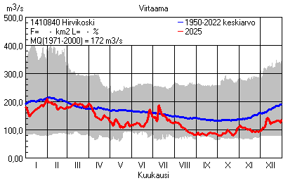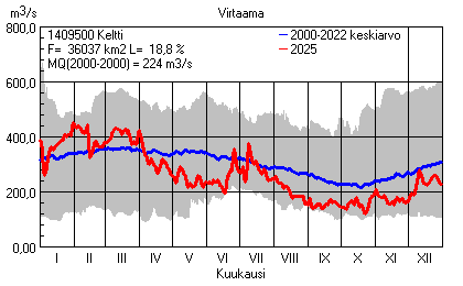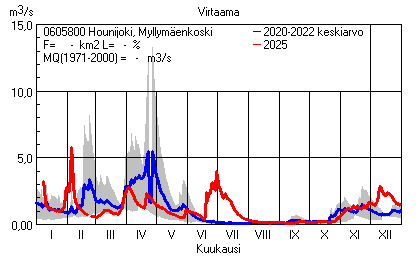 Päivitetty 02.01.2026 18:57 Vesistöjen virtaama Kaakkois-Suomen elinkeino-, liikenne- ja ympäristökeskuksen alueella 2025Kuvat ovat linkkejä suurempiin kuviin ja havaintojen lukuarvoihin Päivittäisten virtaamien vaihteluväli (harmaa alue) ja keskiarvo (sininen viiva) on laskettu keskiarvon esittämälle jaksolle