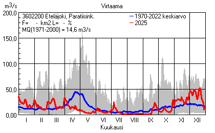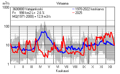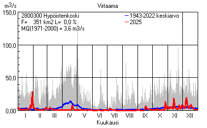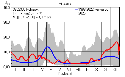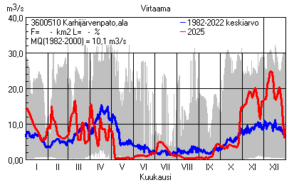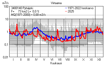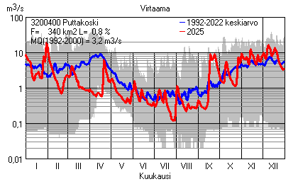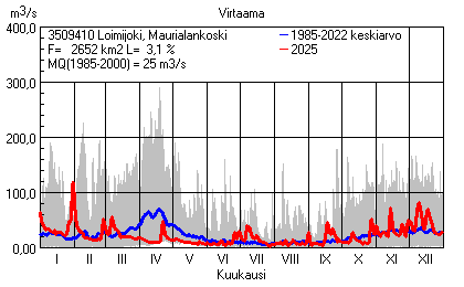 Päivitetty 02.01.2026 18:57 Vesistöjen virtaama Varsinais-Suomen elinkeino-, liikenne- ja ympäristökeskuksen alueella 2025Kuvat ovat linkkejä suurempiin kuviin ja havaintojen lukuarvoihin Päivittäisten virtaamien vaihteluväli (harmaa alue) ja keskiarvo (sininen viiva) on laskettu keskiarvon esittämälle jaksolle