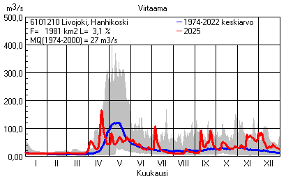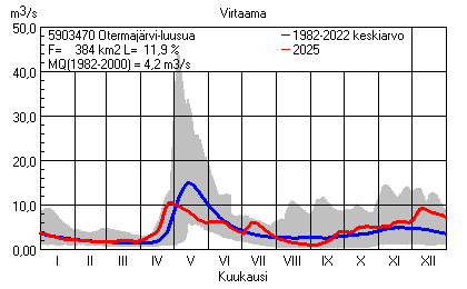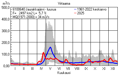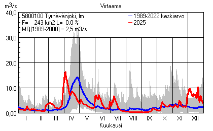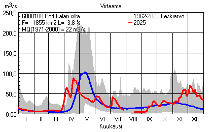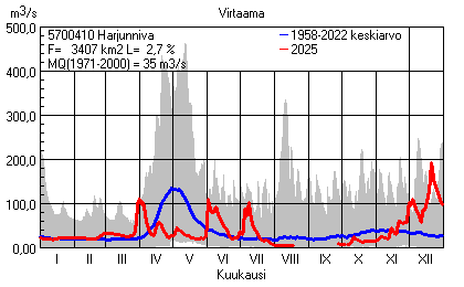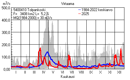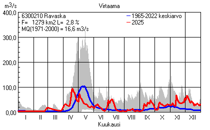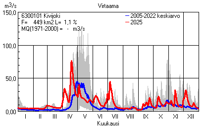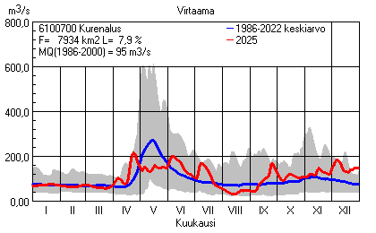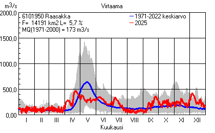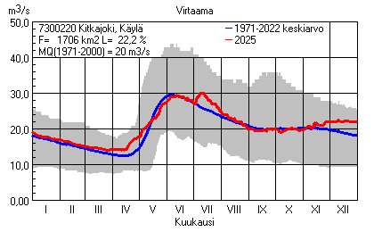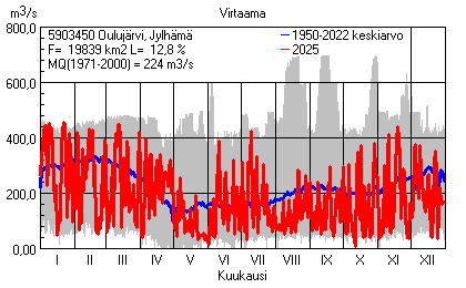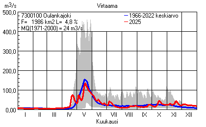 Päivitetty 02.01.2026 18:57 Vesistöjen virtaama Pohjois-Pohjanmaan elinkeino-, liikenne- ja ympäristökeskuksen alueella 2025Kuvat ovat linkkejä suurempiin kuviin ja havaintojen lukuarvoihin Päivittäisten virtaamien vaihteluväli (harmaa alue) ja keskiarvo (sininen viiva) on laskettu keskiarvon esittämälle jaksolle