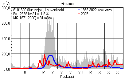 Päivittäisten virtaamien vaihteluväli (harmaa alue) ja keskiarvo (sininen viiva) on laskettu keskiarvon esittämälle jaksolle