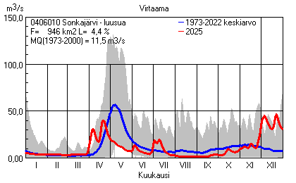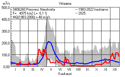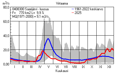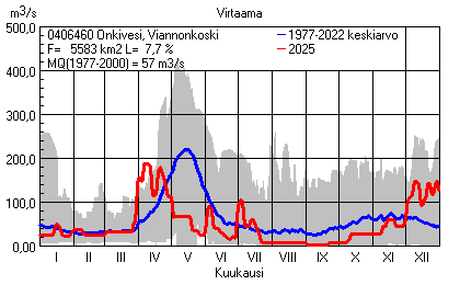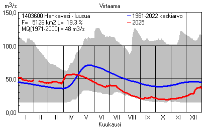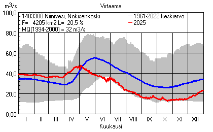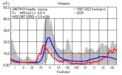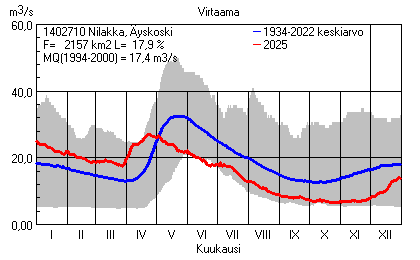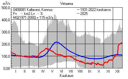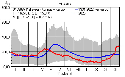 Päivitetty 02.01.2026 18:57 Vesistöjen virtaama Pohjois-Savon elinkeino-, liikenne- ja ympäristökeskuksen alueella 2025Kuvat ovat linkkejä suurempiin kuviin ja havaintojen lukuarvoihin Päivittäisten virtaamien vaihteluväli (harmaa alue) ja keskiarvo (sininen viiva) on laskettu keskiarvon esittämälle jaksolle