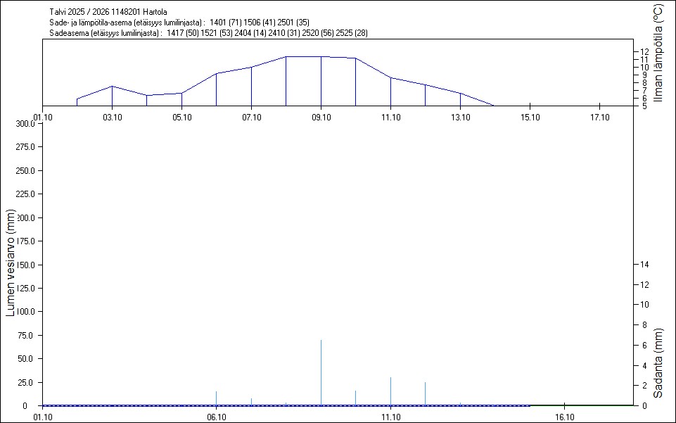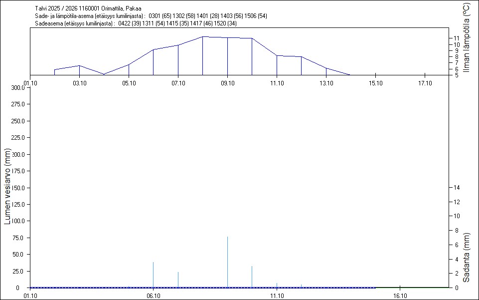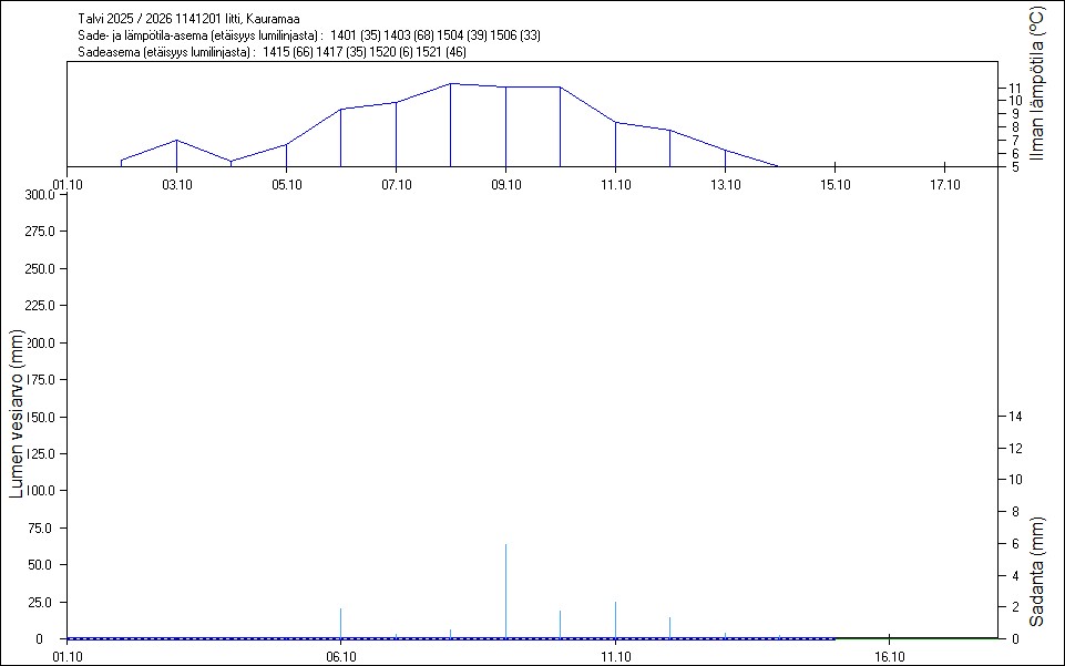 Maastossa mitatut lumen vesiarvot näkyvät kuvissa punaisina tähtinä. Sininen viiva kuvaa säähavaintoihin perustuvalla, mittaustuloksiin sovitetulla lumimallilla laskettuja päivittäisiä lumen vesiarvoja. Katkoviiva näyttää lumimallin laskentatulokset ilman sovitusta mittaustuloksiin. Lumilinjalle lasketut sademäärät näkyvät pystyviivoina kuvan alareunassa, lämpötilat yläreunassa. Vesisade on merkitty vaaleansinisellä viivalla, lumisade mustalla.