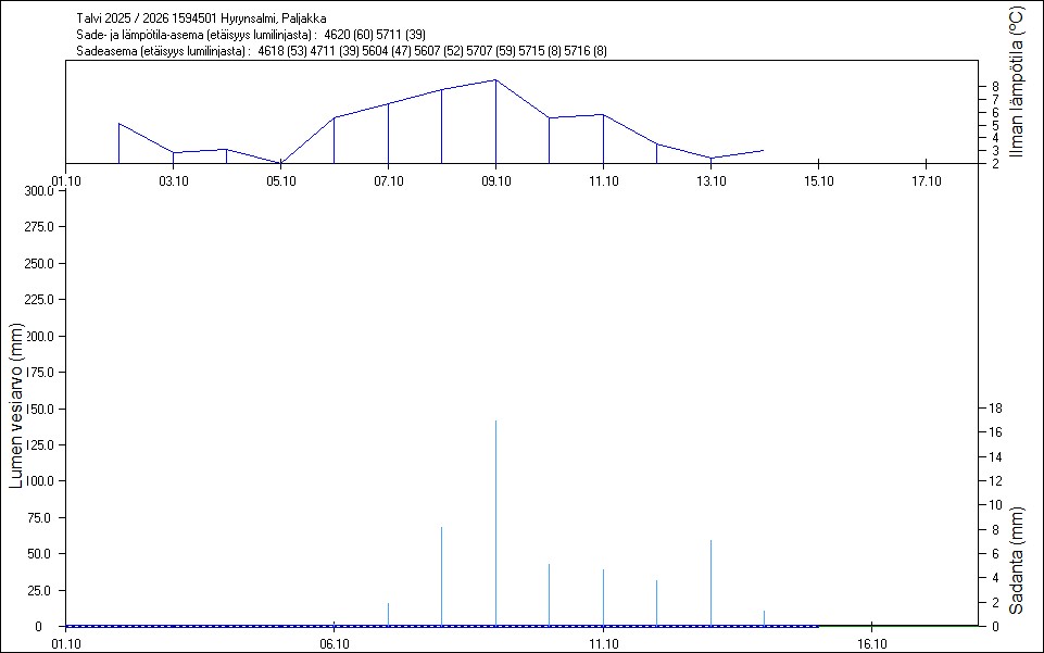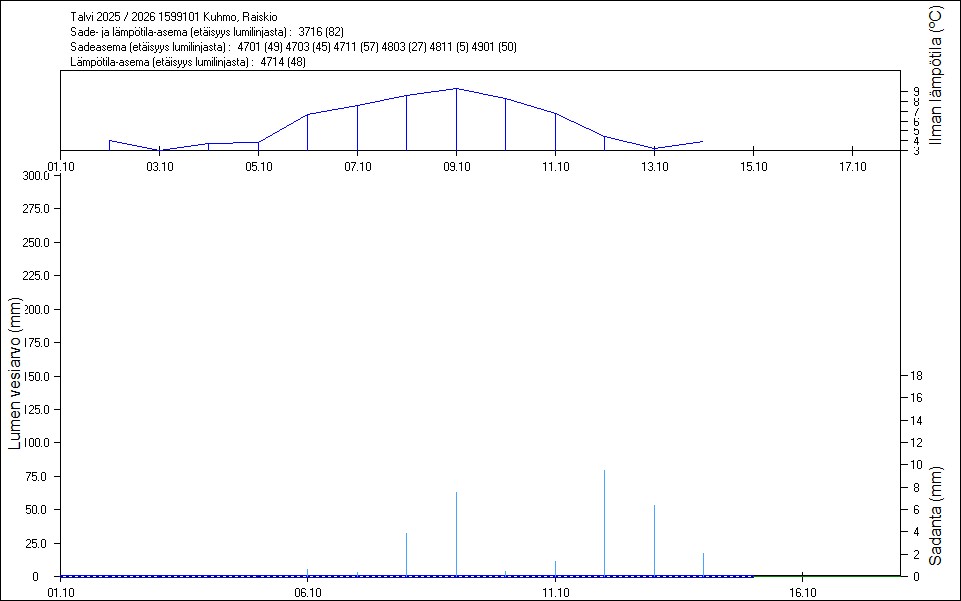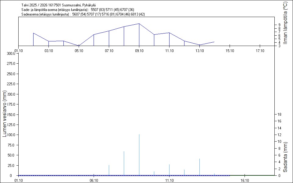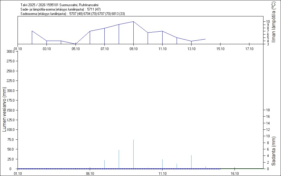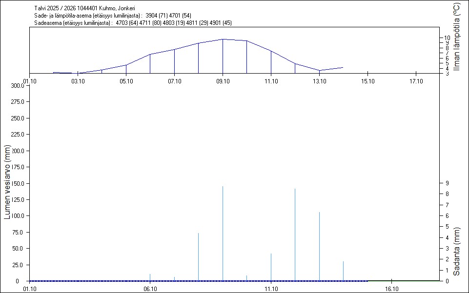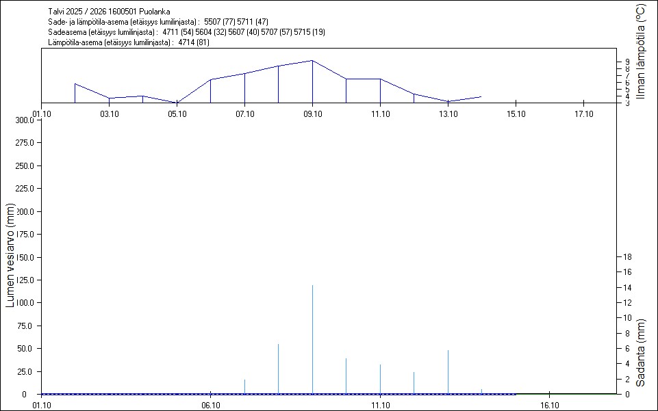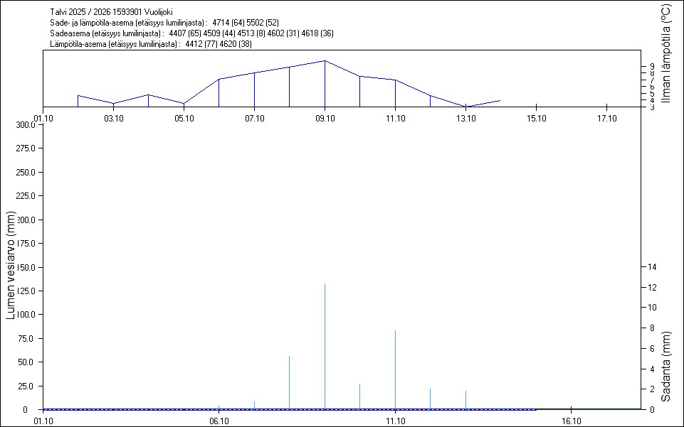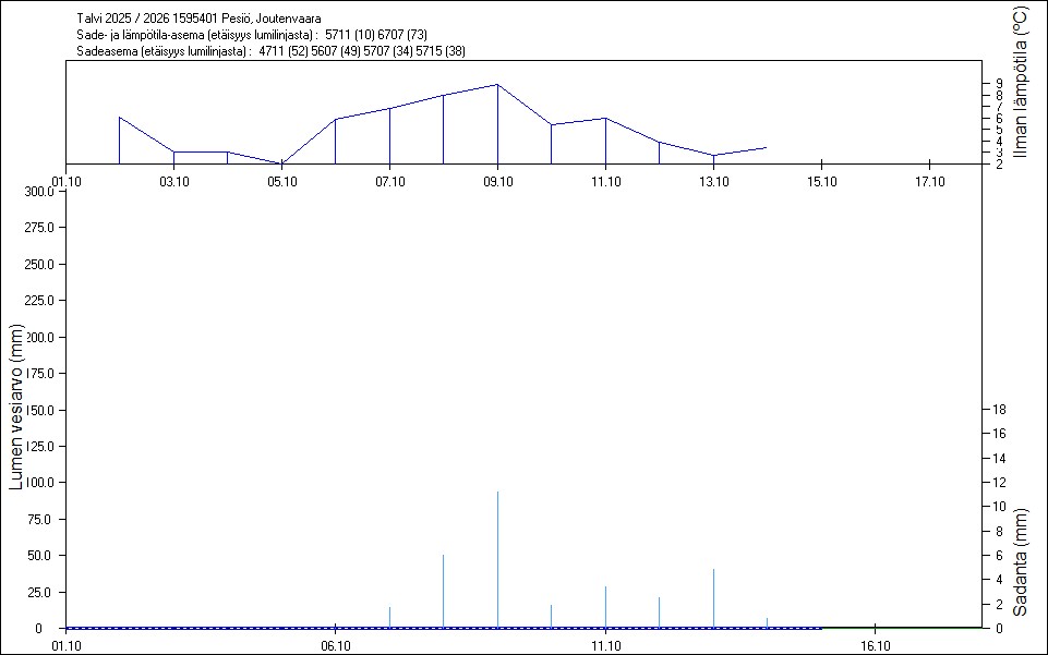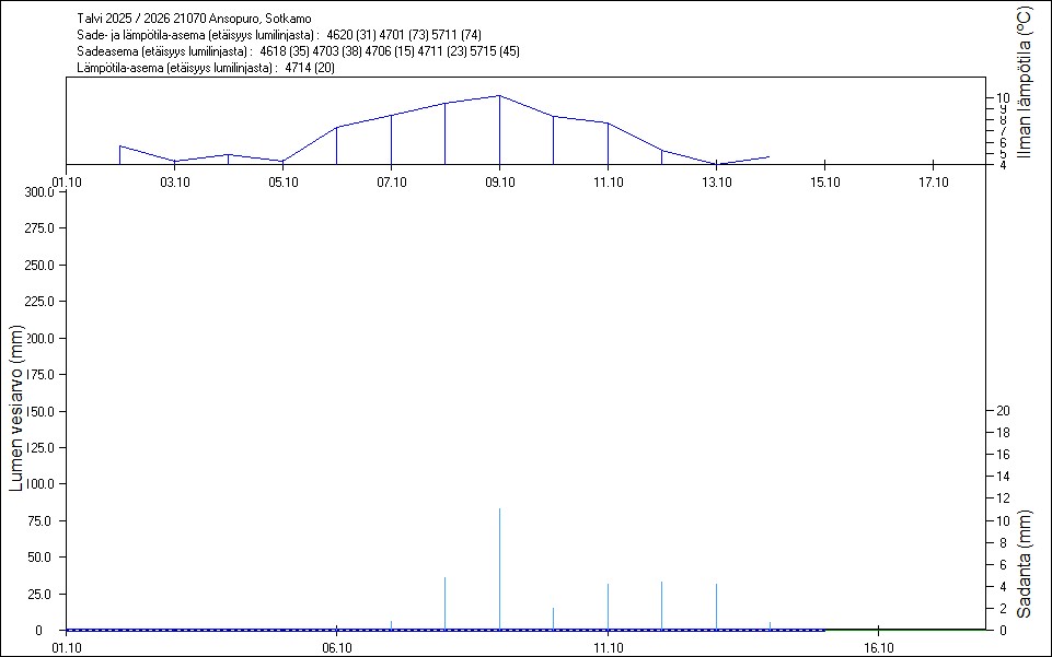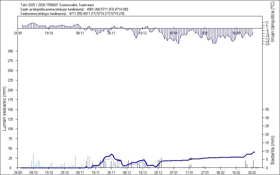 Maastossa mitatut lumen vesiarvot näkyvät kuvissa punaisina tähtinä. Sininen viiva kuvaa säähavaintoihin perustuvalla, mittaustuloksiin sovitetulla lumimallilla laskettuja päivittäisiä lumen vesiarvoja. Katkoviiva näyttää lumimallin laskentatulokset ilman sovitusta mittaustuloksiin. Lumilinjalle lasketut sademäärät näkyvät pystyviivoina kuvan alareunassa, lämpötilat yläreunassa. Vesisade on merkitty vaaleansinisellä viivalla, lumisade mustalla.