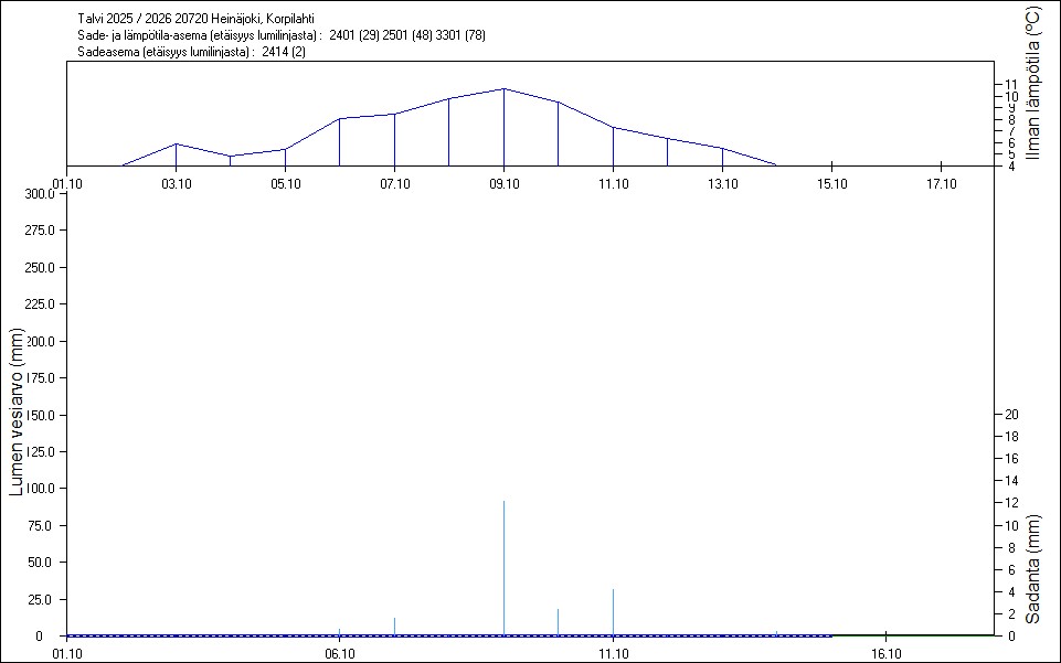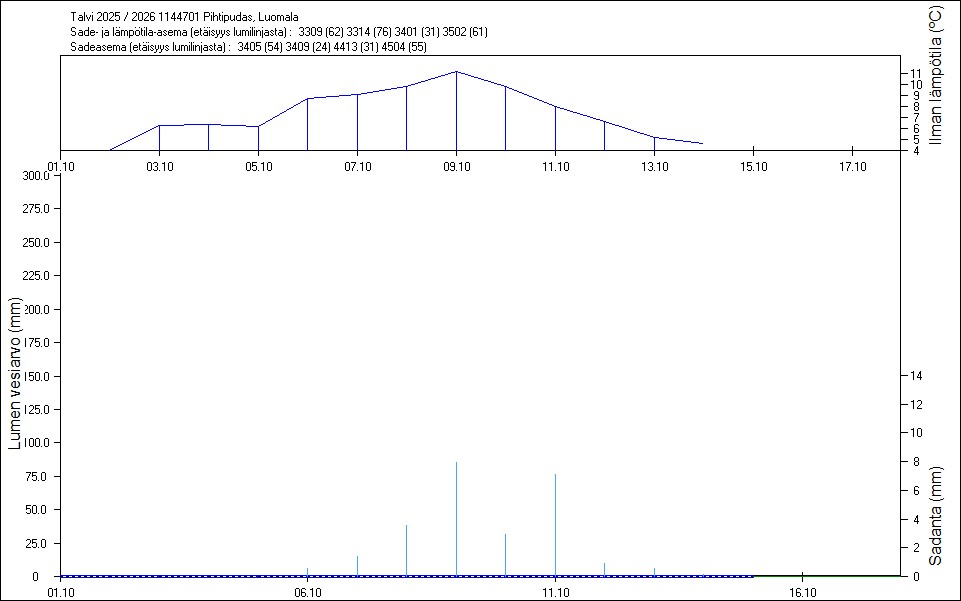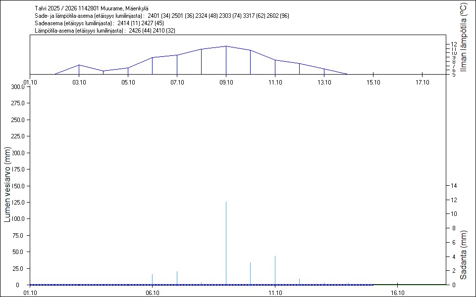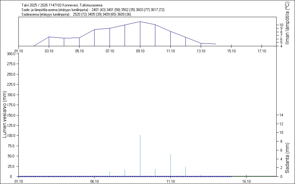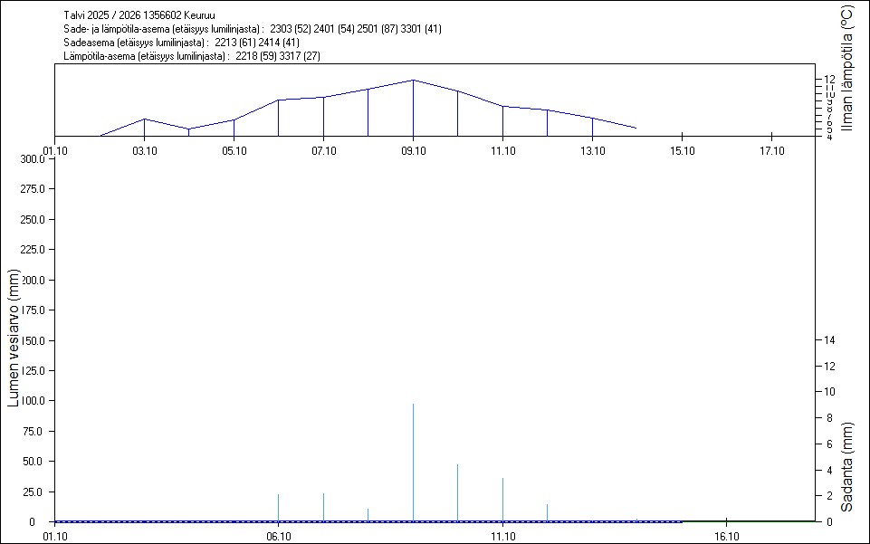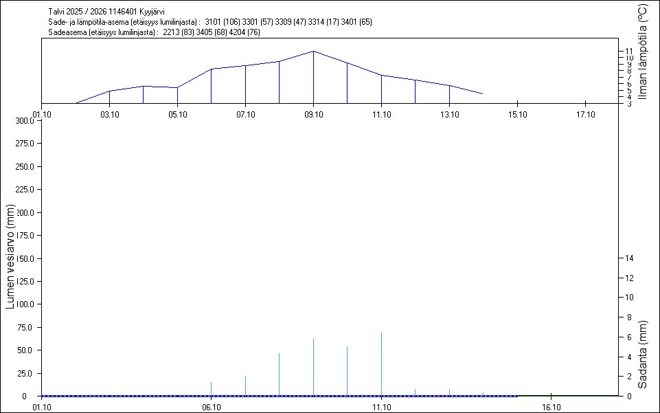 Maastossa mitatut lumen vesiarvot näkyvät kuvissa punaisina tähtinä. Sininen viiva kuvaa säähavaintoihin perustuvalla, mittaustuloksiin sovitetulla lumimallilla laskettuja päivittäisiä lumen vesiarvoja. Katkoviiva näyttää lumimallin laskentatulokset ilman sovitusta mittaustuloksiin. Lumilinjalle lasketut sademäärät näkyvät pystyviivoina kuvan alareunassa, lämpötilat yläreunassa. Vesisade on merkitty vaaleansinisellä viivalla, lumisade mustalla.