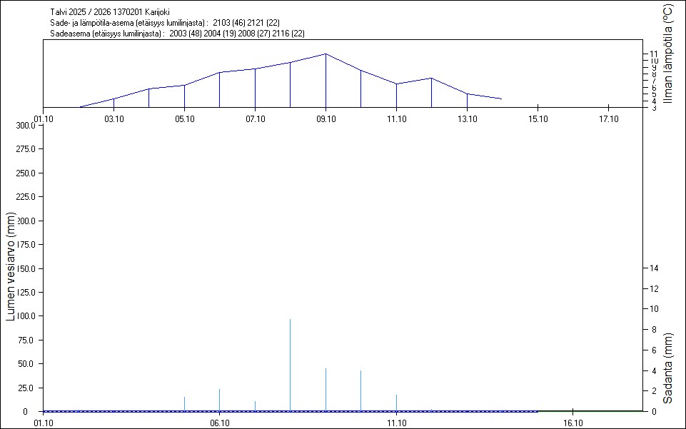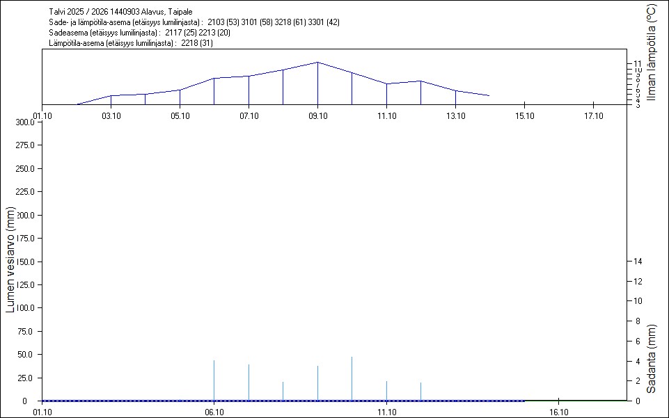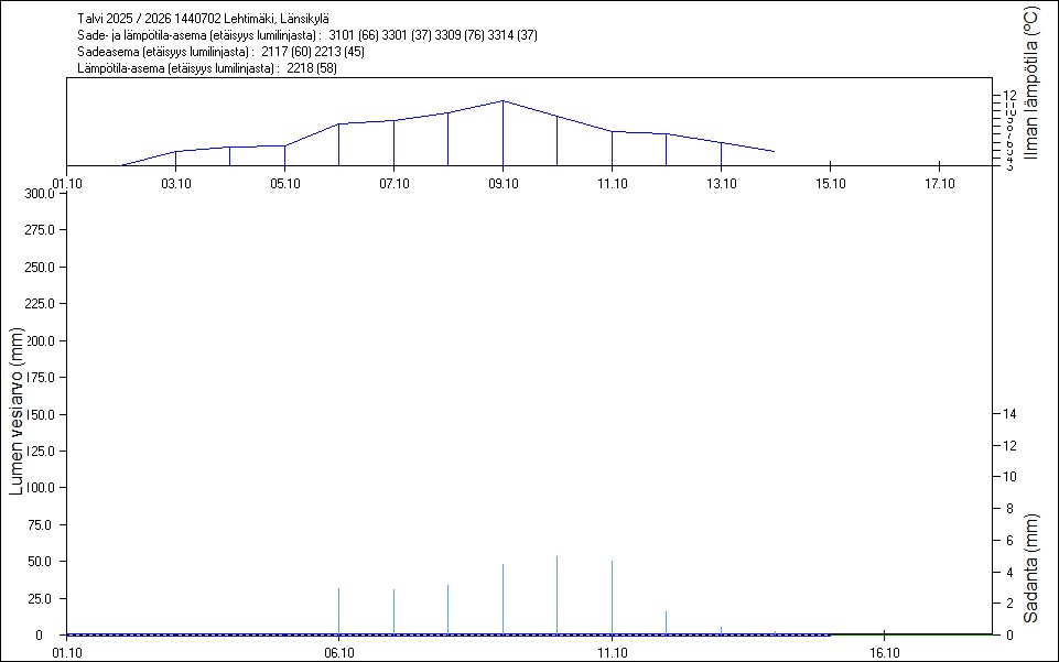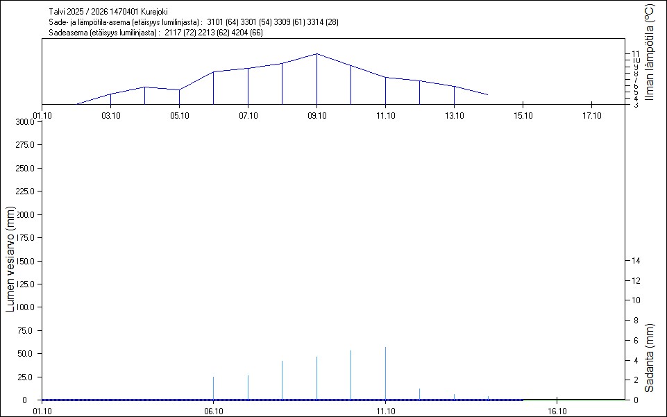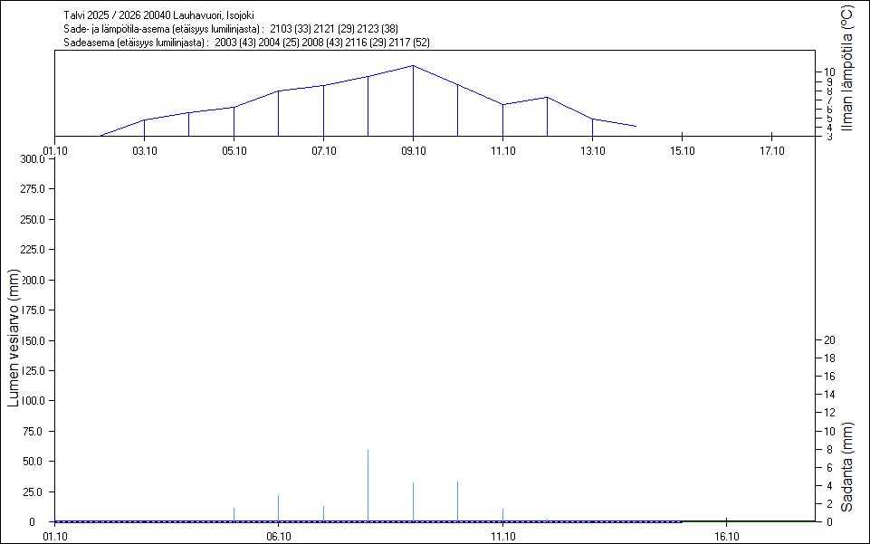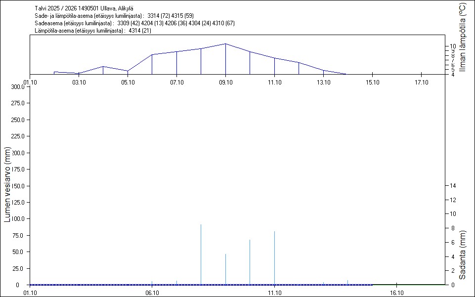 Maastossa mitatut lumen vesiarvot näkyvät kuvissa punaisina tähtinä. Sininen viiva kuvaa säähavaintoihin perustuvalla, mittaustuloksiin sovitetulla lumimallilla laskettuja päivittäisiä lumen vesiarvoja. Katkoviiva näyttää lumimallin laskentatulokset ilman sovitusta mittaustuloksiin. Lumilinjalle lasketut sademäärät näkyvät pystyviivoina kuvan alareunassa, lämpötilat yläreunassa. Vesisade on merkitty vaaleansinisellä viivalla, lumisade mustalla.