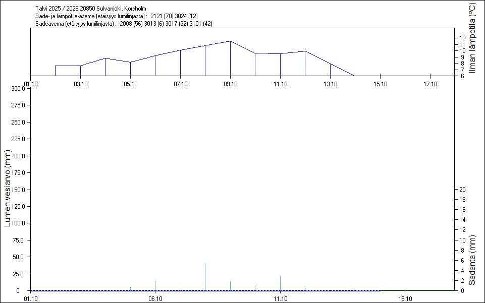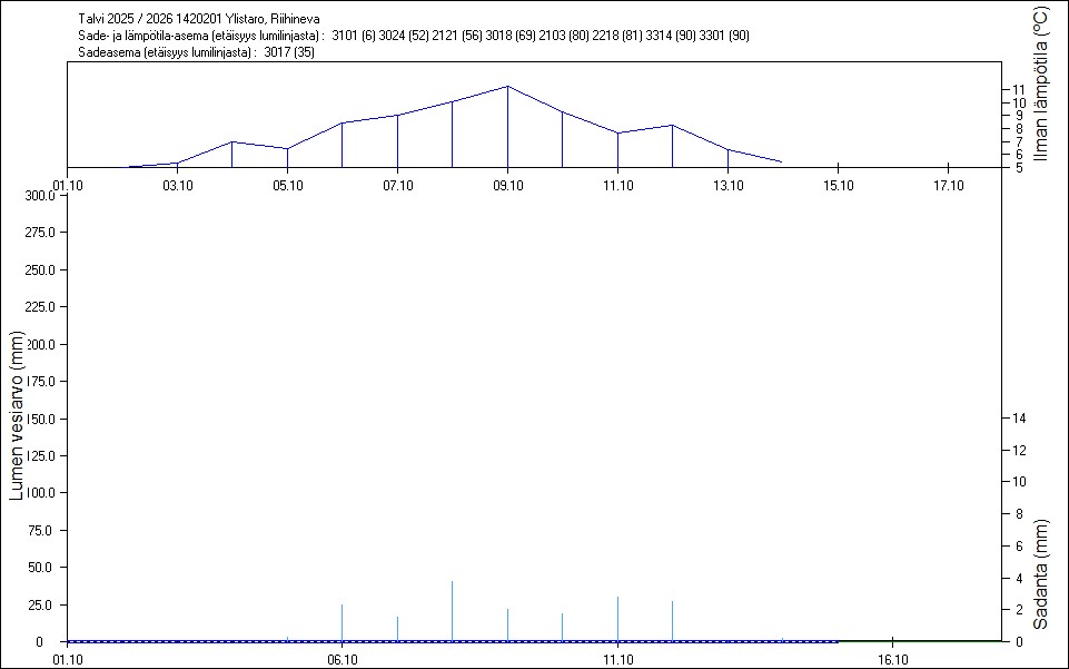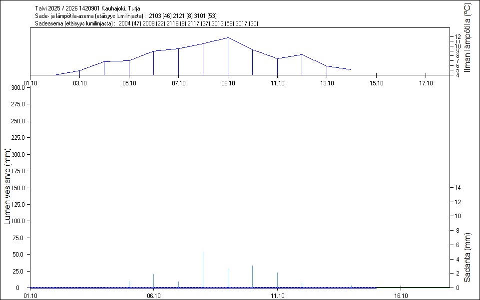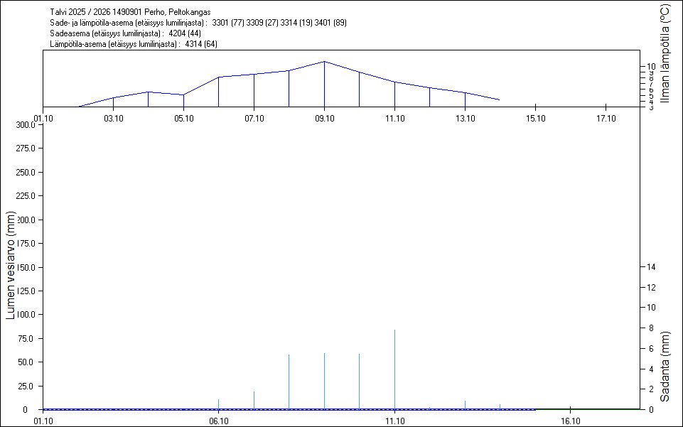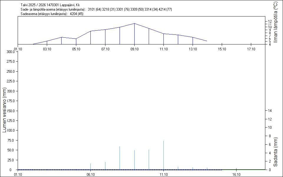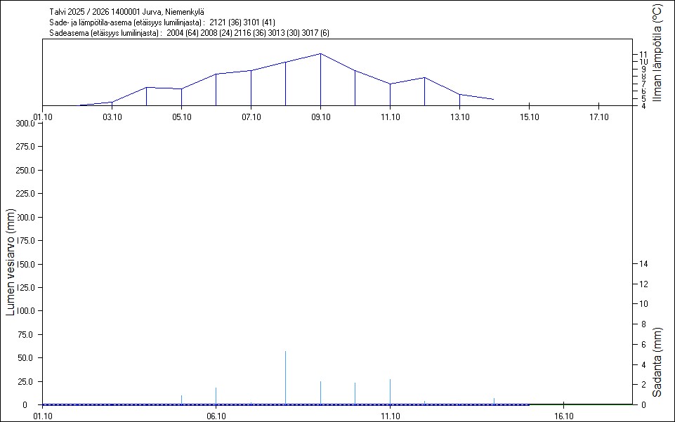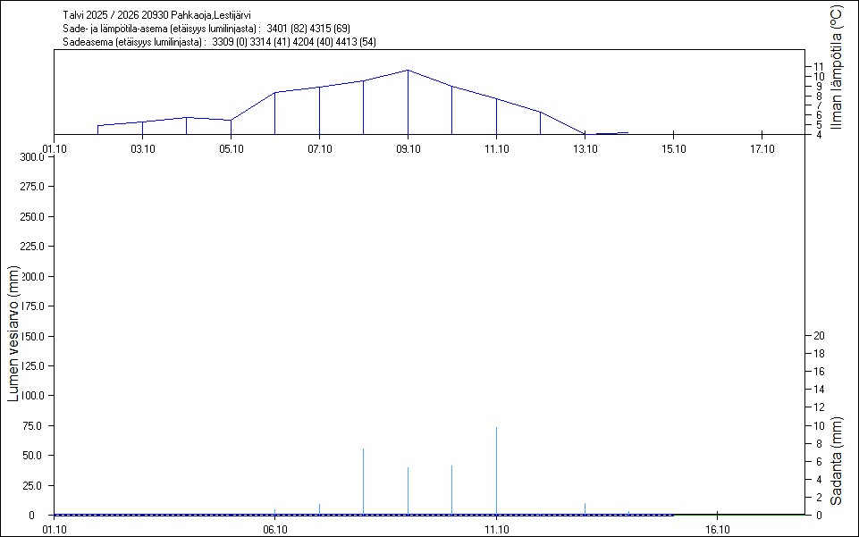 Maastossa mitatut lumen vesiarvot näkyvät kuvissa punaisina tähtinä. Sininen viiva kuvaa säähavaintoihin perustuvalla, mittaustuloksiin sovitetulla lumimallilla laskettuja päivittäisiä lumen vesiarvoja. Katkoviiva näyttää lumimallin laskentatulokset ilman sovitusta mittaustuloksiin. Lumilinjalle lasketut sademäärät näkyvät pystyviivoina kuvan alareunassa, lämpötilat yläreunassa. Vesisade on merkitty vaaleansinisellä viivalla, lumisade mustalla.