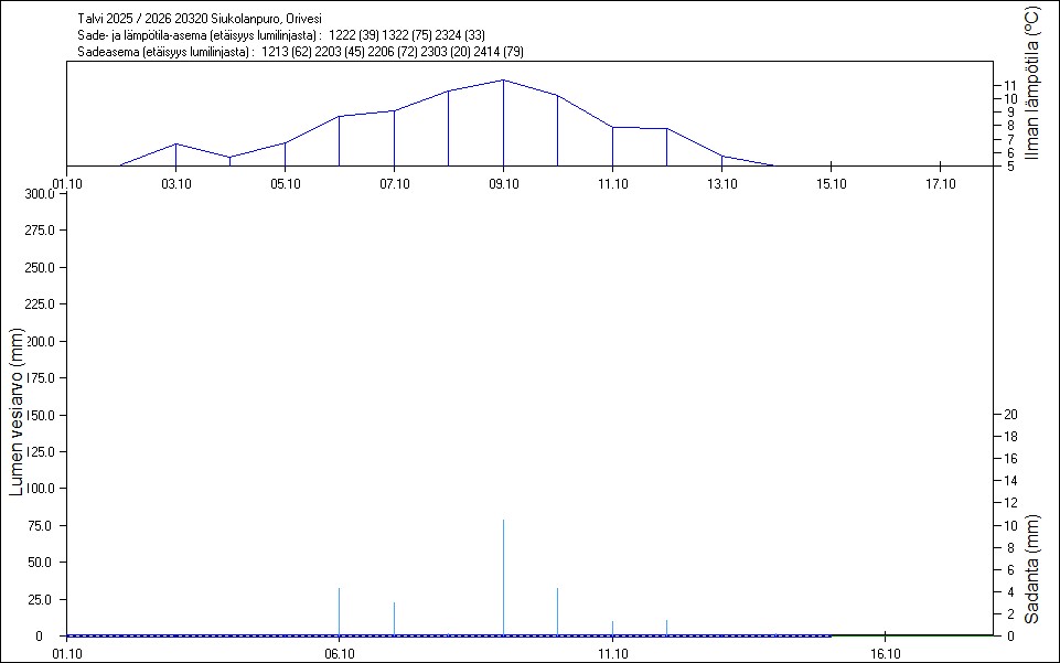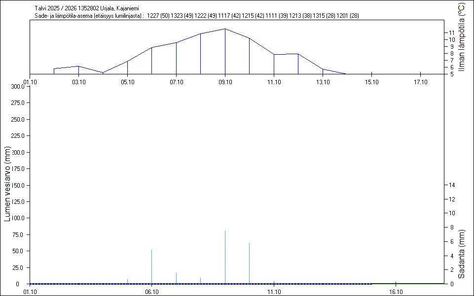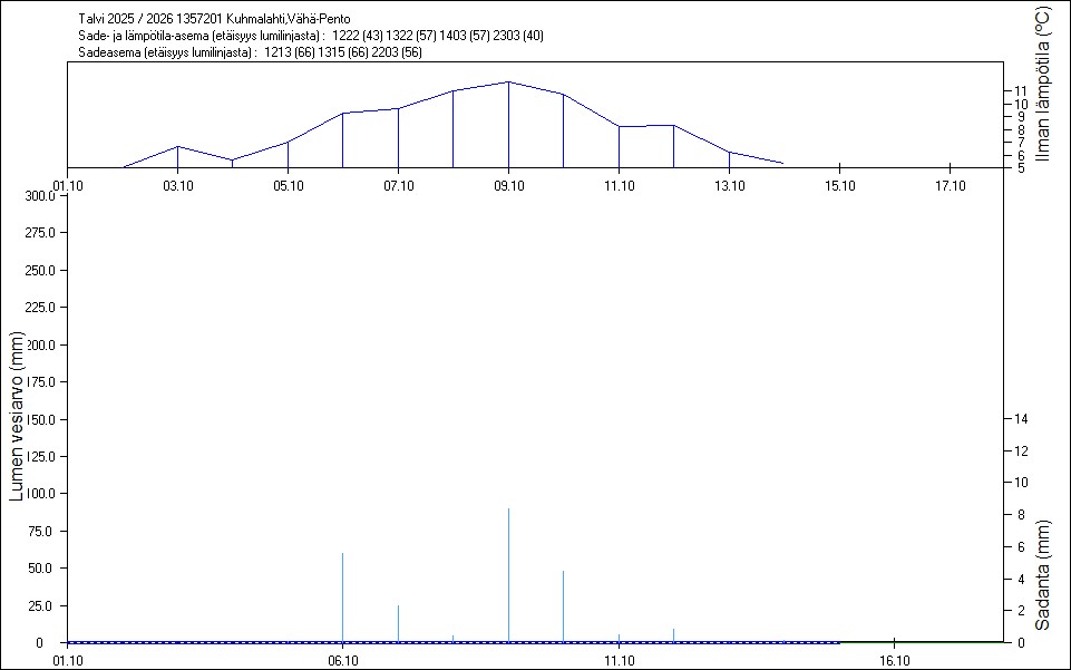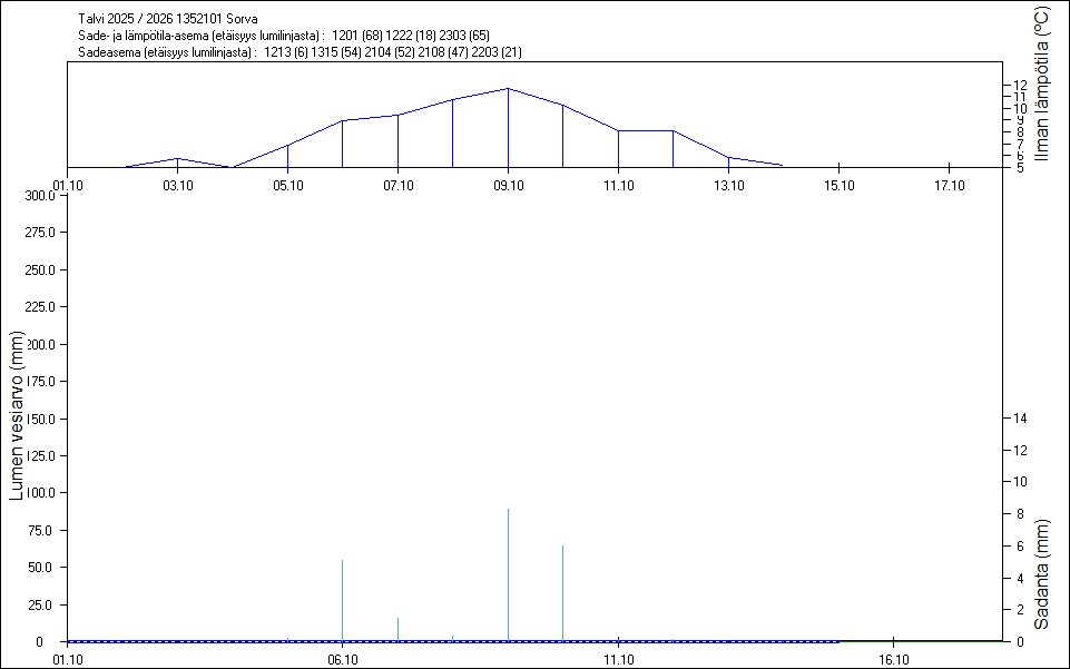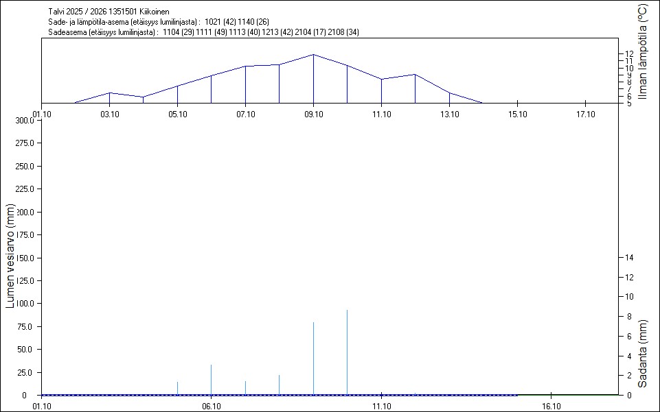Maastossa mitatut lumen vesiarvot näkyvät kuvissa punaisina tähtinä. Sininen viiva kuvaa säähavaintoihin perustuvalla, mittaustuloksiin sovitetulla lumimallilla laskettuja päivittäisiä lumen vesiarvoja. Katkoviiva näyttää lumimallin laskentatulokset ilman sovitusta mittaustuloksiin. Lumilinjalle lasketut sademäärät näkyvät pystyviivoina kuvan alareunassa, lämpötilat yläreunassa. Vesisade on merkitty vaaleansinisellä viivalla, lumisade mustalla.
