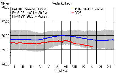 HUOM! ARVOT OVAT TARKISTAMATTOMIA. KUVAT PÄIVITTYVÄT AUTOMAATTISESTI ILMAN MANUAALISTA TARKISTUSTA.Päivitetty 18.10.2025 18:59 Vesistöjen vedenkorkeus Etelä-Savon elinkeino-, liikenne- ja ympäristökeskuksen alueellaKorkeusjärjestelmä: NNMuut korkeusjärjestelmät: N2000 N60 N43 AsteikkoPaluuKuvat ovat linkkejä suurempiin kuviin ja havaintojen lukuarvoihin Päivittäisten vedenkorkeuksien vaihteluväli (harmaa alue) ja keskiarvo (sininen viiva) on laskettu keskiarvon esittämälle jaksolle